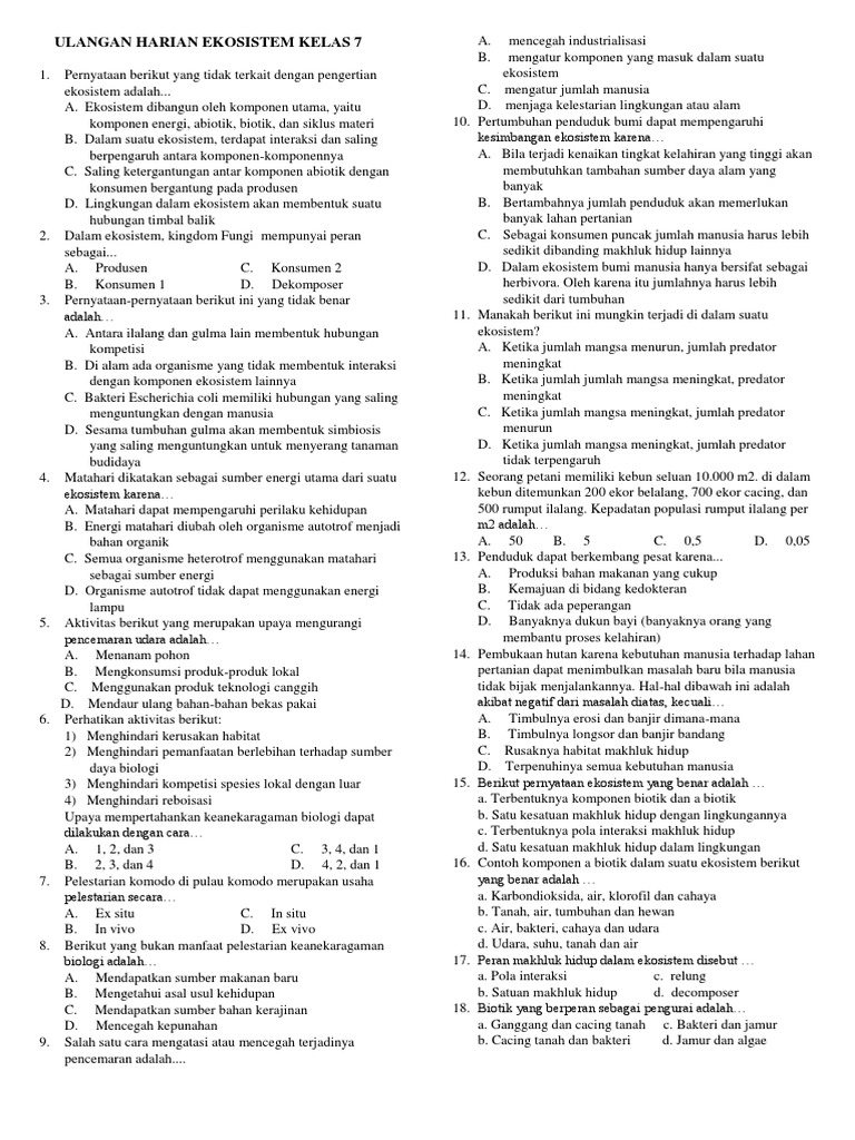 Kumpulan soal ekosistem kelas 7.doc. Silahkan untuk soal lain seperti Soal UN IPA SMP bisa anda cek di link disebelah. Soal Dan Jawaban Tentang Ekosistem Kelas 10 Ekosistem ini merupakan salah satu materi yang dipelajari di sma ma atau bahkan di smp. Kunci Jawaban Soal Bab Ekosistem 1 C 11 D 21 C 31 A 2 D 12 D 22 A 32 C 3 C 13 E 23 A 4 E 14 B 24 A 5 A 15 A 25 D 6 D 16 E 26 E 7 A 17 A 27 D 8 B 18 C 28 C 9 C 19 A 29 A 10 D 20 C 30 A Link.