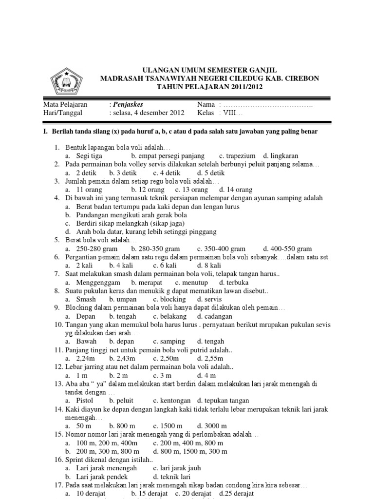Pilihlah jawaban yang paling tapat dengan cara memberi tanda silang x pada huruf a b c atau d pada lembar jawaban yang tersedia. Soal UAS Penjas SMP Kelas 8 Semester 1Dowload Soal Latihan UAS Penjas PJOK SMP MTs Kelas 8 Semester 1 Ganjil Gasal tahun 2016 2017 terbaru untuk berlatih mengadapi ujian akhis semester tahun ini. Soal pilihan ganda tentang bola voli dan kunci jawaban bola voli adalah satu materi yang dipelajari pada mata pelajaran penjaskes smp mts sampai sma ma.