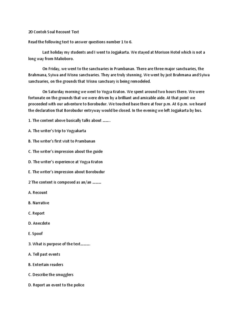Contoh soal recount text pilgan beserta jawabannya dengan topik personal experiences ini sebagai pelengkap untuk latihan soal recount text smp kelas 8. Berikut informasi sepenuhnya tentang contoh soal recount text smp kelas 8 beserta jawabannya. We stayed at Dirgahayu Hotel which is not far from Malioboro.