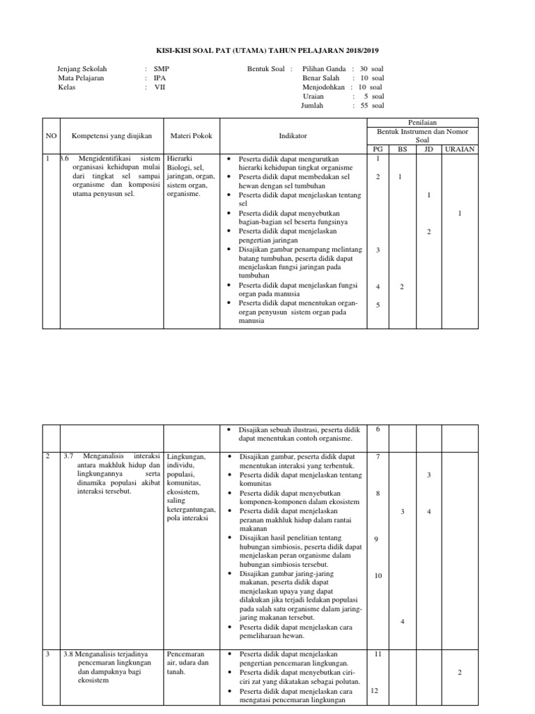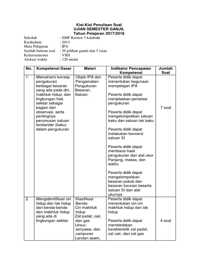 Kisi-Kisi dan Soal PAS IPA SMP kelas 7 8 9 Semester 1 Tahun Ajaran 20202021 Soal PAS IPA SMP Soal tiap tema disusun dalam bentuk pilihan ganda dan soal uraian. Kisi-kisi tersebut dapat dijadikan sebagai referensi dalam pembuatan kisi-kisi soal PAS Kelas 9. Download kisi kisi pkn smp kelas 7 semester ganjil.