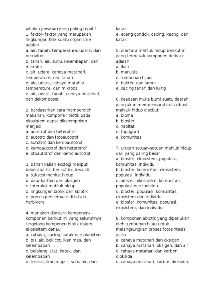 Pembaca sekolahmuonline berikut ini kami sajikan contoh soal mata pelajaran biologi kelas x dan jawabannya. Ekologi keanekaragaman hayati ekosistem dan lingkungan hidup b. Soal dan Jawaban Riviu Pembelajaran 8.