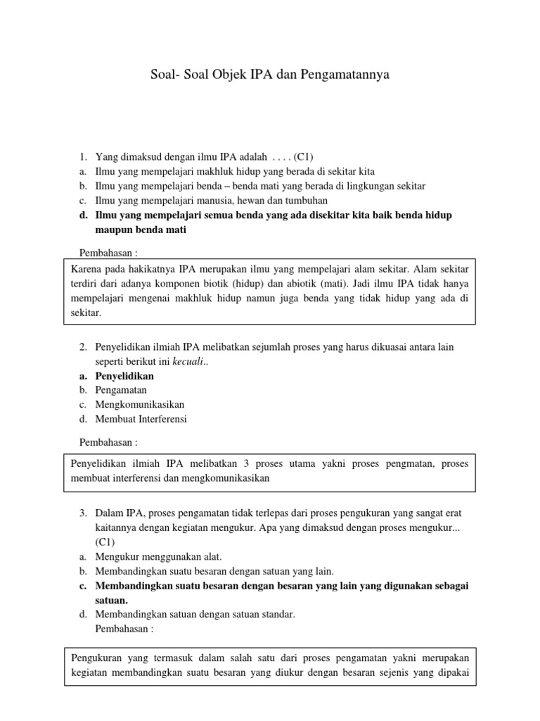 Dalam IPA proses pengamatannya tidak terlepas dari proses PENGUKURAN. Sekolahmuonline contoh soal ipa pilihan ganda dan jawabannya bab 1 objek ipa dan pengamatannya ipa kelas 7 smpmts. Objek IPA Objek yang dipelajari dalam IPA meliputi semua benda yang ada di alam mulai dari benda yang yang paling kecil partikel atom makhluk hidup hingga benda yang sangat besar seperti laut bumi matahari dan sebagainya.