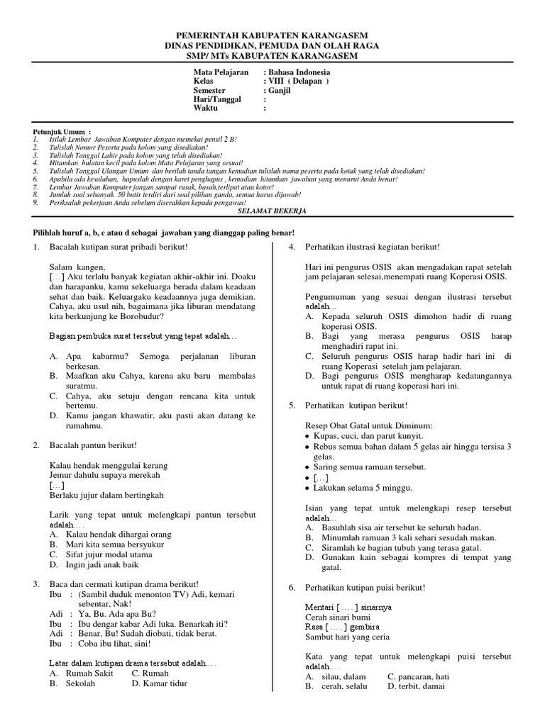 Soal Uas Genap Bahasa Indonesia 2014 2015 Smp Kelas 8 Kota Mataram