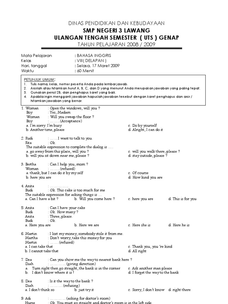 2 Soal UTS Bahasa Inggris Kelas 8 Semester 2 Genap - Kumpulin Soal uts 2 inggr. Narrative comparison dan modals can could and be able to. Kamu juga bisa cobain SOAL solusi latihan soal online yang berbobot lengkap dan sesuai kurikulum terbaru di Kelas Pintar seperti soal Matematika Fisika dan masih banyak lagi.