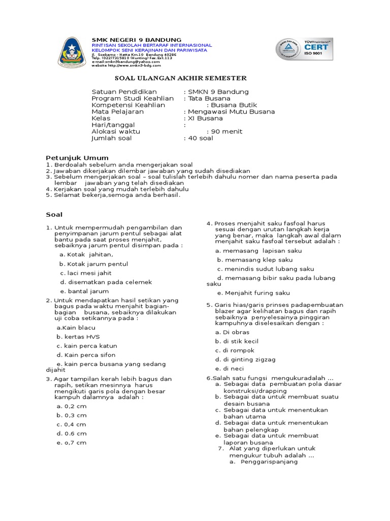 Oleh karena itu bapak dan ibu guru harus mempersiapkan. Contoh soal desain busana kelas 12 beserta jawabannya. 2 Soal UTS Al.